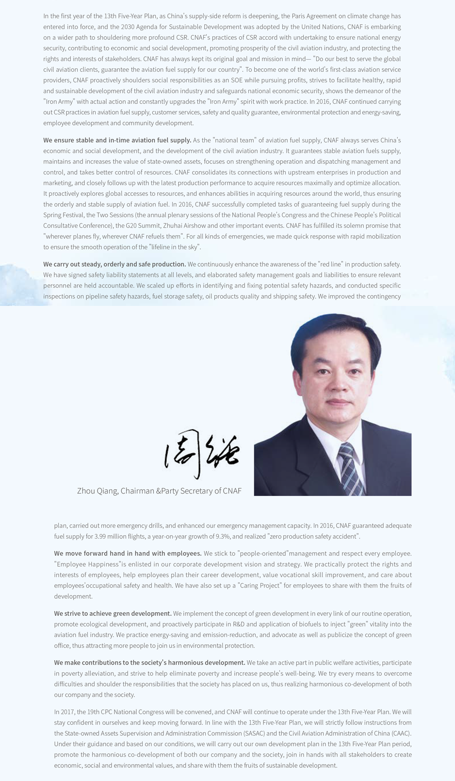 CNAF controls and holds shares of over 20 companies at home and abroad,operating an intensive nationwide sales network, logistics and distribution system of aviation fuel, refined oil products and petrochemicals. The aviation fuel business covers 219 commercial airports in China where CNAF has its own fuel supply facilities and extends the market to 48 overseas airports. CNAF offers into-plane services to more than 300 airlines globally. The refined oil product and petrochemicals business deals with the wholesale, retail, storage and distribution of gasoline, diesel and petrochemicals in 25 provinces in China. The logistic business involves fuel tanker shipping, storage, wharf, pipeline transportation with large logistics and storage facilities in the Yangtze River Delta Region, the Pearl River Delta Region, the Pan Bohai Bay Rim Region and Southwest China.